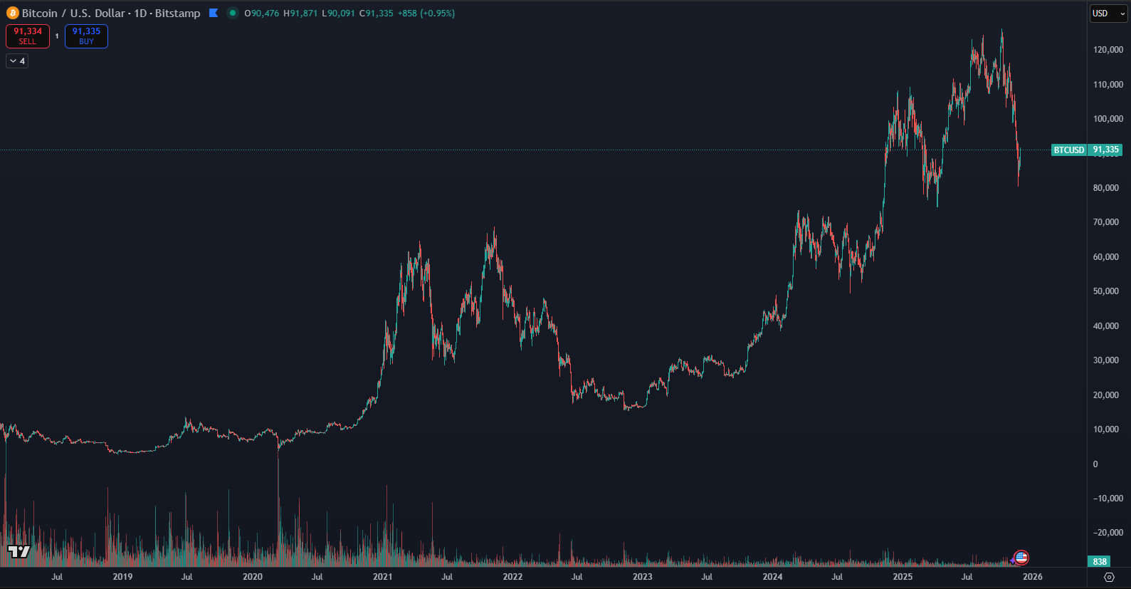 Bitcoin má za sebou volatilné obdobie, keďže jeho hodnota skĺzla z historického maxima 126 200 dolárov až k hranici 80 000 dolárov. Tento prepad predstavoval korekciu o 36 %, po ktorej však digitálne aktívum dokázalo získať mierny spätný impulz a opäť sa podľa TradingView vyšvihlo nad hranicu 90 000 dolárov.