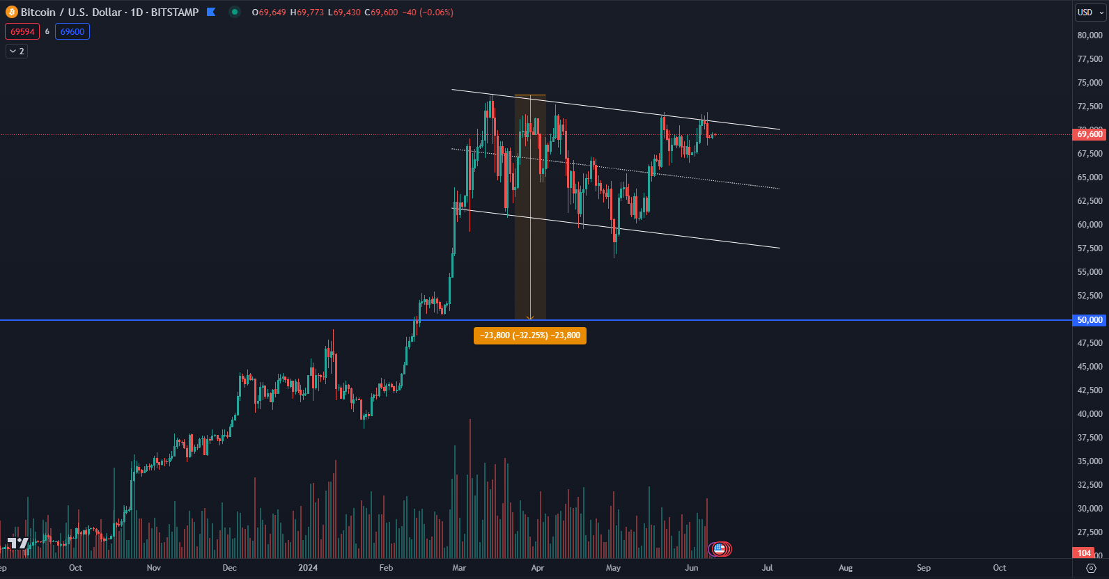 Keď by sme hľadali odpoveď na otázku, či Bitcoin môže klesnúť na 50 000 dolárov, odpoveď by bola áno. Dokonca aj za takého predpokladu, že po korekcii by pokračoval dlhodobý cenový rast. Ak by ale cena skutočne mala ísť na 50 000 dolárov, zrejme by nenastal tak silný vzostupný odraz začiatkom mája, aký sme videli. Bitcoin v máji totiž vymazal takmer celý predošlý pád. To naznačuje, že korekcia čoskoro skončí.