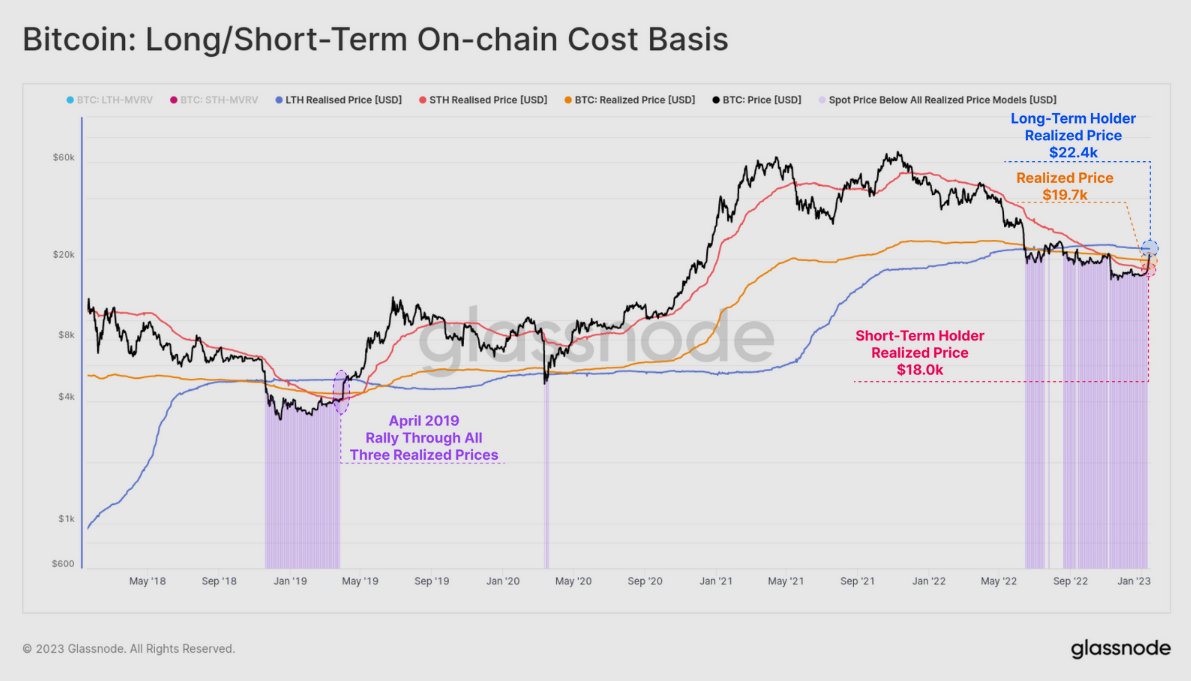 O podrobnej analýze Bitcoinu pre rok 2023 sme vás informovali už skôr. Stále totižto platí, že halvingové cykly boli neporušené a prípadné sformovanie dna v najbližších mesiacoch potvrdí ďalší štvorročný proces. Súčasné priblíženie sa realizovanej ceny LTH aj STH signalizuje homogénnu základňu nákladov bez ohľadu na dobu držania mincí. Vždy keď tento scenár nastal, Bitcoin definitívne potvrdil dno.