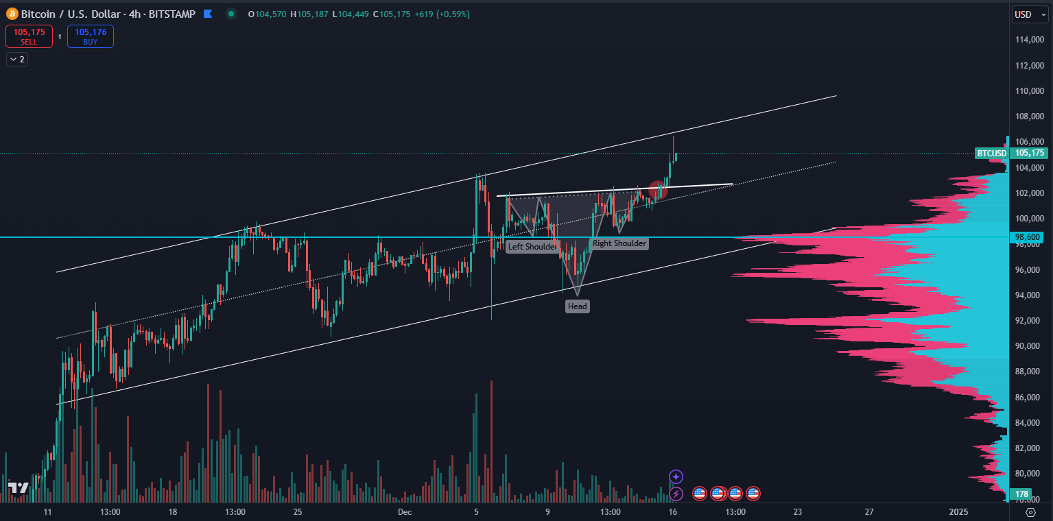 Z krátkodobého hľadiska Bitcoin vytvoril cenový vzor s názvom Head and shoulders (hlava a ramená). Ide o reverzný vzor, ktorý predstavuje signál k ďalšiemu trendu, tentokrát k rastu. Cena prekonala rezistenciu tohto vzoru (červený kruh) a následne prestrelila úrovne až na maximum 106 500 dolárov.