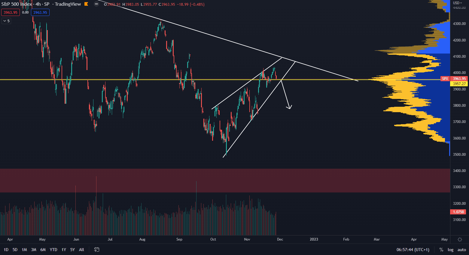 Ako vidíme na grafe nižšie, SPX sa nachádza v rastúcom kline, ktorý už mohol dosiahnuť vrchol. Z krátkodobého hľadiska cena sformovala dvojitý vrchol na hladine 4 030 bodov a smeruje na support tohto klinu. V prípade, že cena udrží minimum 3 900 bodov, je možné, že SPX klesne na hlavnú rezistenciu.