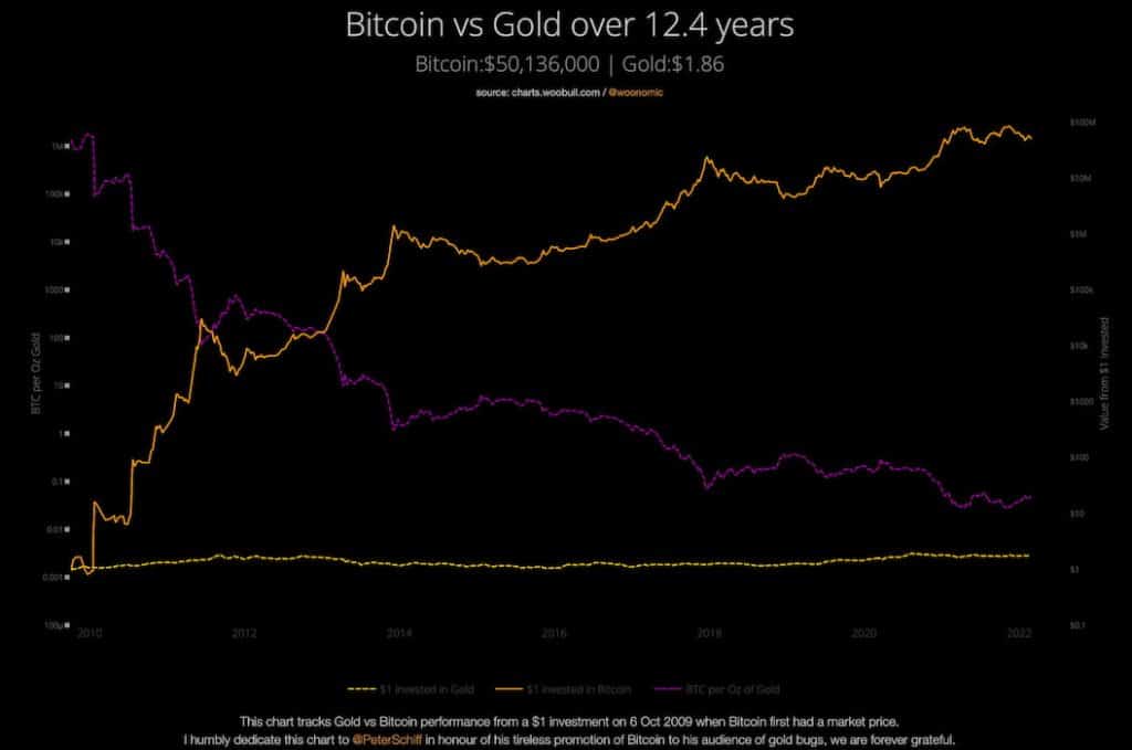Porovnanie investície do BTC a zlata pred 5 rokmi. Zdroj: charts.woobull.com