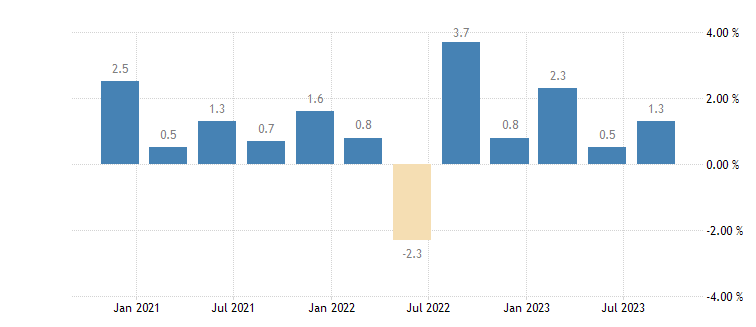 Podľa údajov Tradingeconomics vzrástla čínska ekonomika v 3. štvrťroku 2023 o sezónne upravených 1,3 %. Expanzia je len mierna a podporuje ju predovšetkým množstvo monetárnych stimulačných opatrení. Patrí sem znižovanie úrokových sadzieb a neustále injekcie likvidity zo strany centrálnej banky.