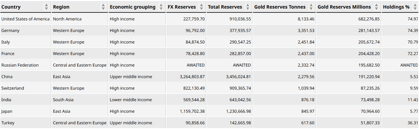 Držba zlata v tonách podľa krajín. Zdroj: gold.org