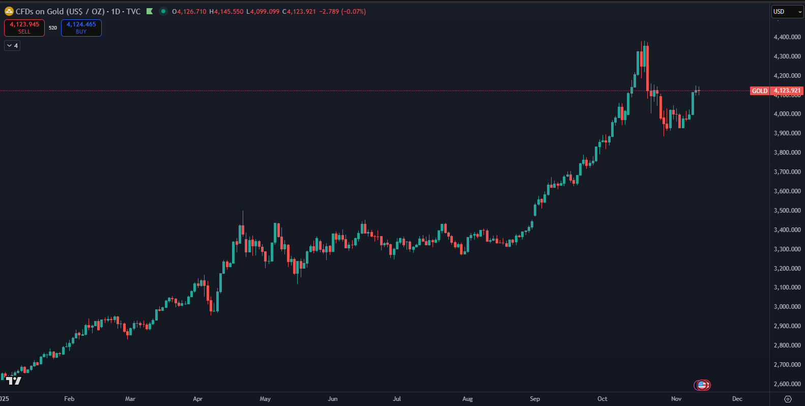Cena zlata sa v posledných mesiacoch stabilizovala po tom, ako v októbri podľa TradingView dosiahla rekordných 4 380 dolárov za uncu, no očakávania ďalšieho rastu sa zvyšujú. Mnoho investorov sleduje vývoj na americkom trhu, kde sa špekuluje o možnom znížení úrokových sadzieb zo strany Federálneho rezervného systému už v decembri.