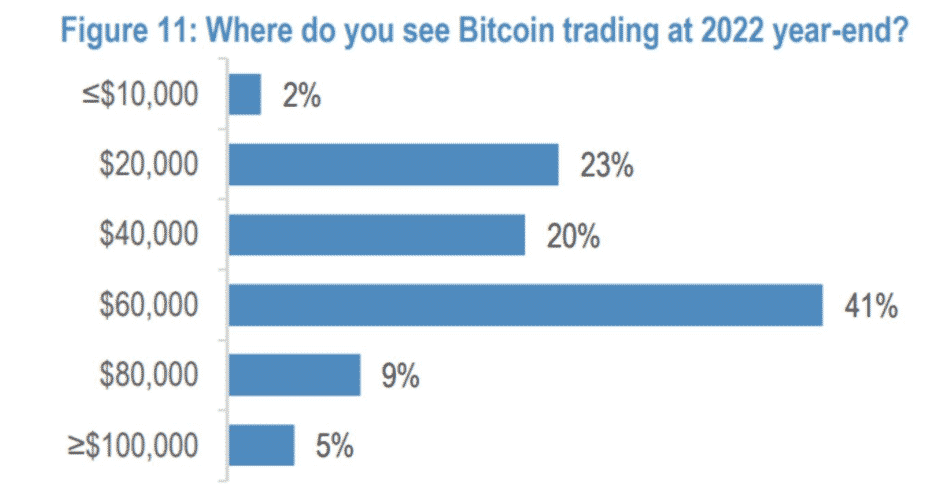 Jedna z najväčších investičných bánk na svete má svoje predpovede cien BTC pripravené na rok 2022. V nedávnom prieskume sa JPMorgan Chase spýtal svojich klientov: Kde vidíte obchodovanie s bitcoinmi na konci roka 2022? Len 5 % uviedlo, že digitálna minca dosiahne 100 000 USD. 9 % uviedlo, že prekoná predchádzajúce historické maximum a dosiahne viac ako 80 000 USD.