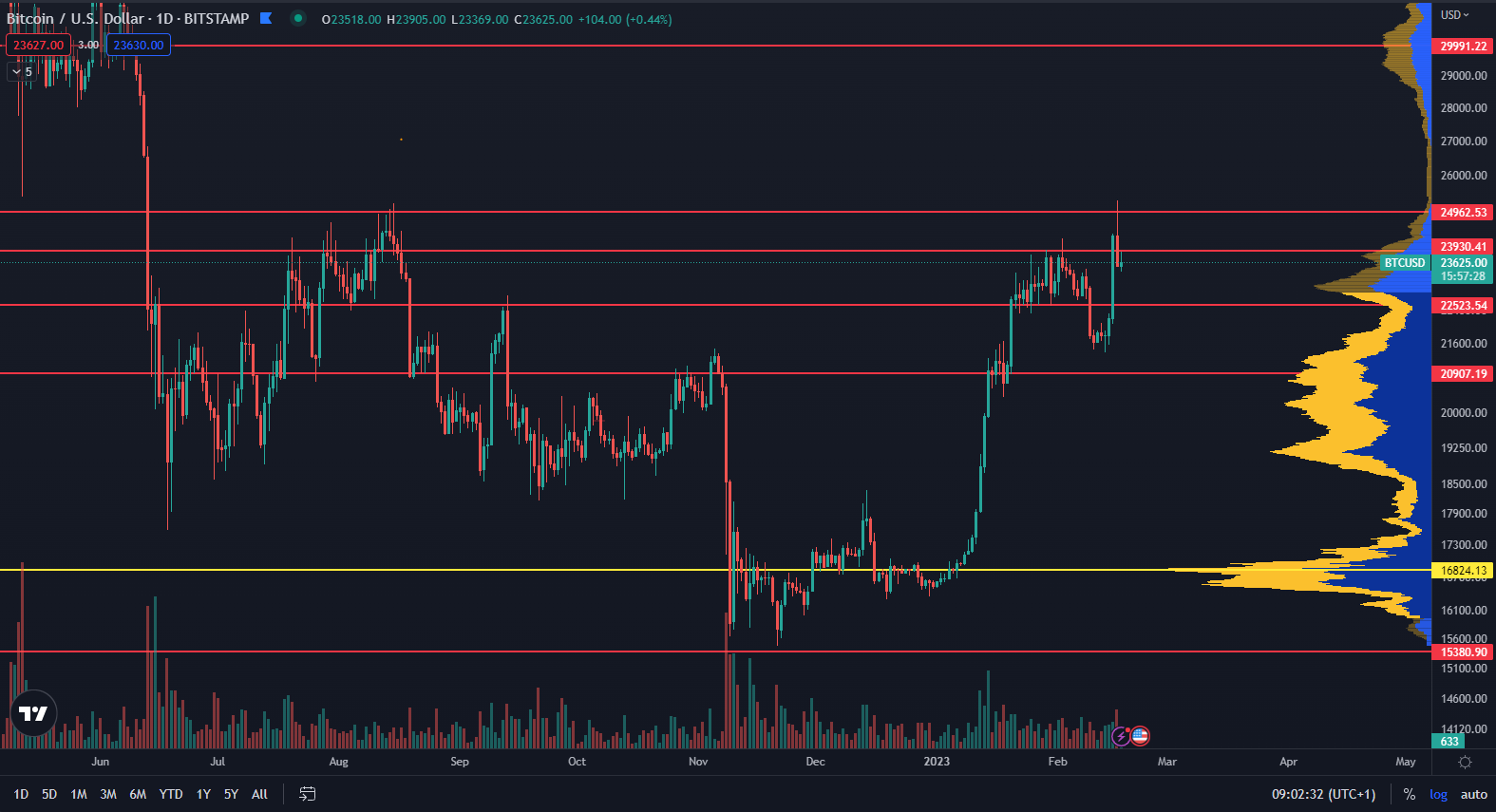 Bitcoin sa za posledné obdobie zhodnotil pomerne rýchlym tempom a počas 15. februára narástol za jediný deň o 2 300 dolárov. Následne sme boli svedkami zamietnutia na rezistencii 25 000 dolárov, kde cena rešpektovala silu predávajúcich aj v minulosti.