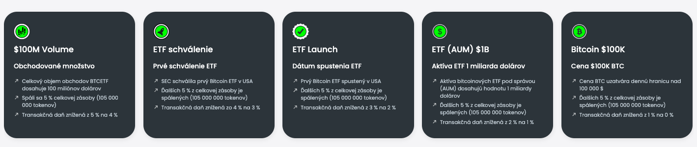 Projekt Bitcoin ETF vznikol na oslavu čoskoro schválených spotových bitcoinových ETF, ktorý majiteľov svojich natívnych tokenov reálne odmení. Ako? Postupným znižovaním transakčnej dane. Klesajúcu daň o 1 % tvorcovia naviazali na päť významných míľnikov spotových ETF. Daň sa tak z pôvodných 5 % zníži o jedno percento napríklad pri dosiahnutí objemu obchodovov Bitcoin ETF v hodnote 100 miliónov, o ďalšie percento pri schválení prvého spotového ETF na Bitcoin, alebo keď hodnota Bitcoinu dosiahne 100 000 dolárov.