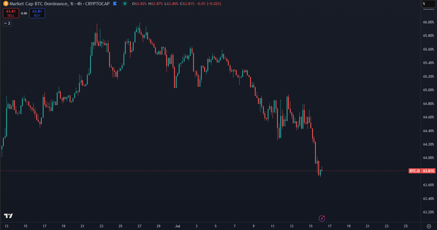 Bitcoin už roky dominuje trhu s kryptomenami, no posledné týždne naznačujú, že jeho dominantné postavenie sa môže začať meniť. Jeho trhová dominancia totiž klesla z 66 % na aktuálnych 63,80 %, čo predstavuje najväčší prepad od mája, ukazujú údaje z TradingView. Zatiaľ ide len o krátkodobý výkyv trvajúci menej ako tri týždne, no trh si ho všíma s veľkou pozornosťou.