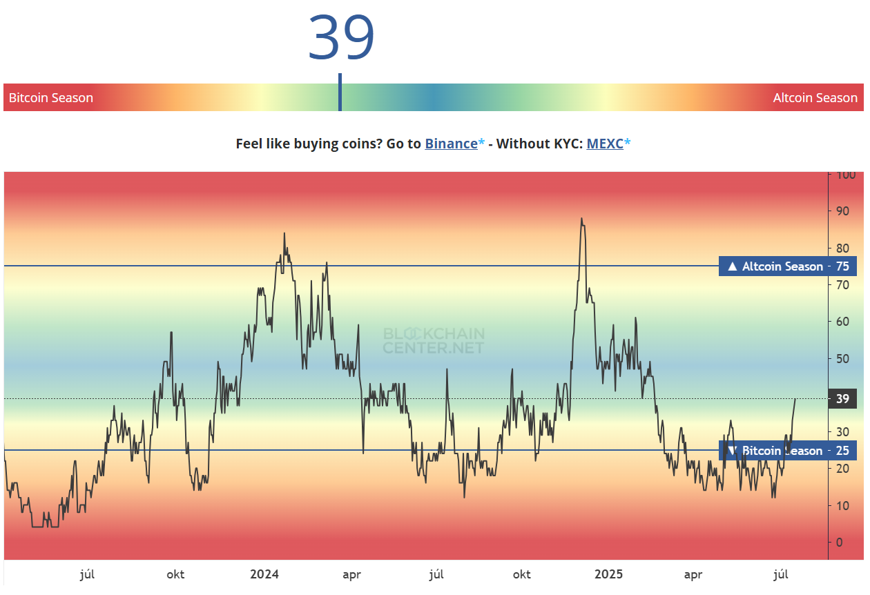 Dôležitým ukazovateľom je tzv. index altcoinovej sezóny, ktorý sleduje výkonnosť 50 najväčších altcoinov za posledných 90 dní v porovnaní s Bitcoinom. Tento index sa podľa údajov Blockchain Center aktuálne nachádza na hodnote 39, čo je najvyššia úroveň od februára. Pre začiatok altcoinovej sezóny je však potrebné, aby prekročil hranicu 75. Napriek tomu ide o signál, že sa trh začína prebúdzať a investori sa začínajú viac zaujímať o iné kryptomeny než len Bitcoin.