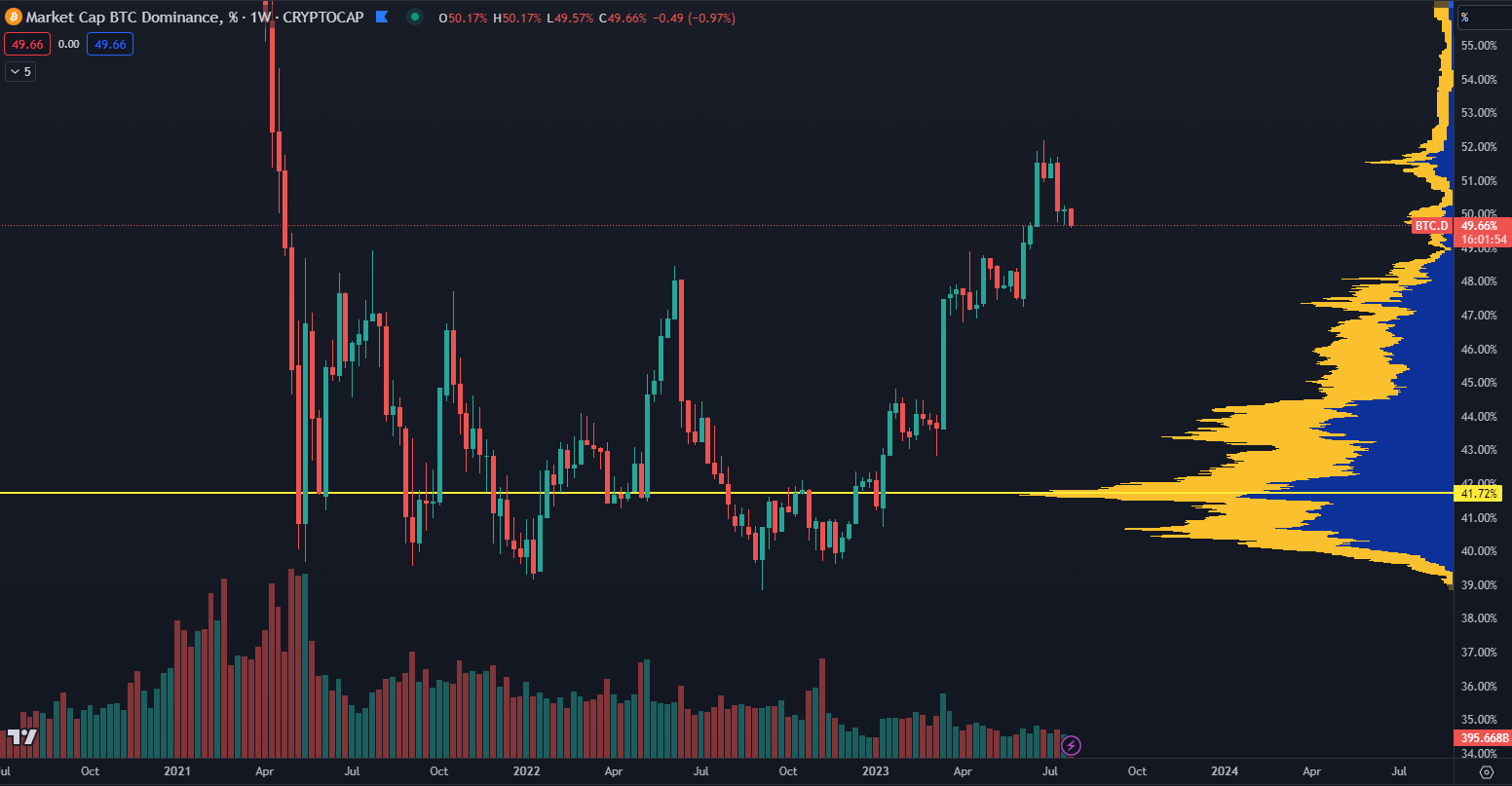 Podľa údajov TradingView je dominancia bitcoinu v čase písania článku na úrovni 49,66 %. Na grafe nižšie vidíme, že zaznamenala mohutný rast od novembra a dosiahla vzostup až o 12,50 % v najvyššom bode. Za posledný mesiac sa ale situácia zásadne zmenila, keďže dominancia klesla z hodnoty 52,18 % na súčasných 49,66 %.