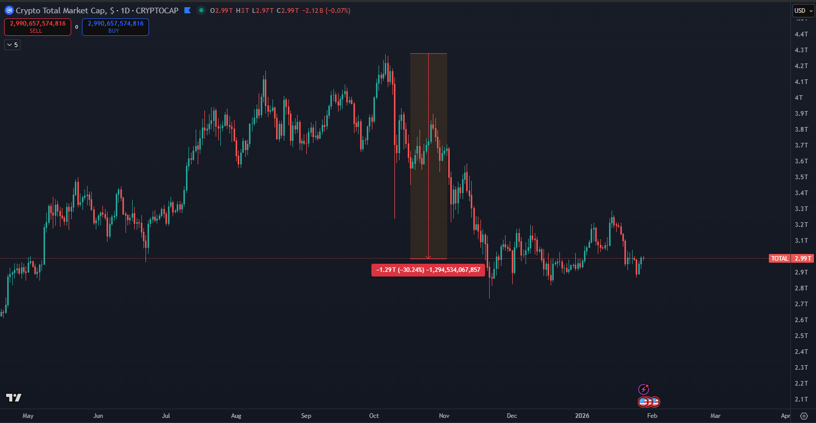 Kryptomeny za posledné mesiace utrpeli jednu z najväčších strát v histórii. Od historického maxima z 6. októbra 2025, kedy celková trhová kapitalizácia dosahovala 4,27 bilióna dolárov, klesla na súčasných 2,99 bilióna dolárov. Údaje z TradingView ukazujú, že ide o stratu približne 1,3 bilióna dolárov, ktorá sa udiala veľmi rýchlo a prekvapila množstvo investorov. Tento pokles nie je len číslo, ale odráža realitu vysokej volatility kryptomien a rizikového charakteru trhu.