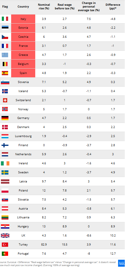 V Taliansku napríklad priemerná mzda vzrástla o 3,9 %, no inflácia bola len 1,2 %, čo viedlo k reálnemu rastu 2,7 %. Avšak priemerná daňová sadzba stúpla o 7,5 %, čo tento rast úplne eliminovalo. Podobná situácia nastala v Estónsku a Česku, kde sa priemerné daňové zaťaženie zvýšilo o viac než 4,5 %.