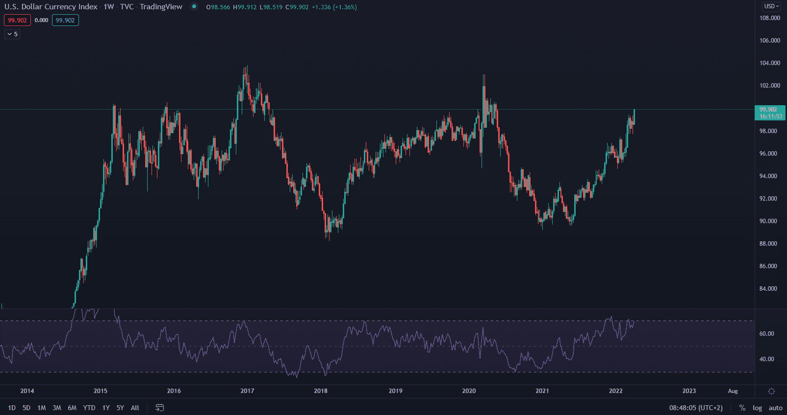 Ako je vidieť nižšie, americký dolár je v rastovom trende už takmer rok. V máji 2021 sa mena dotkla svojho ročného minima blízko 89 a signalizovala ďalšie zhodnocovanie, keďže neistota na globálnych trhoch rastie a investori sa snažia chrániť svoje bohatstvo.