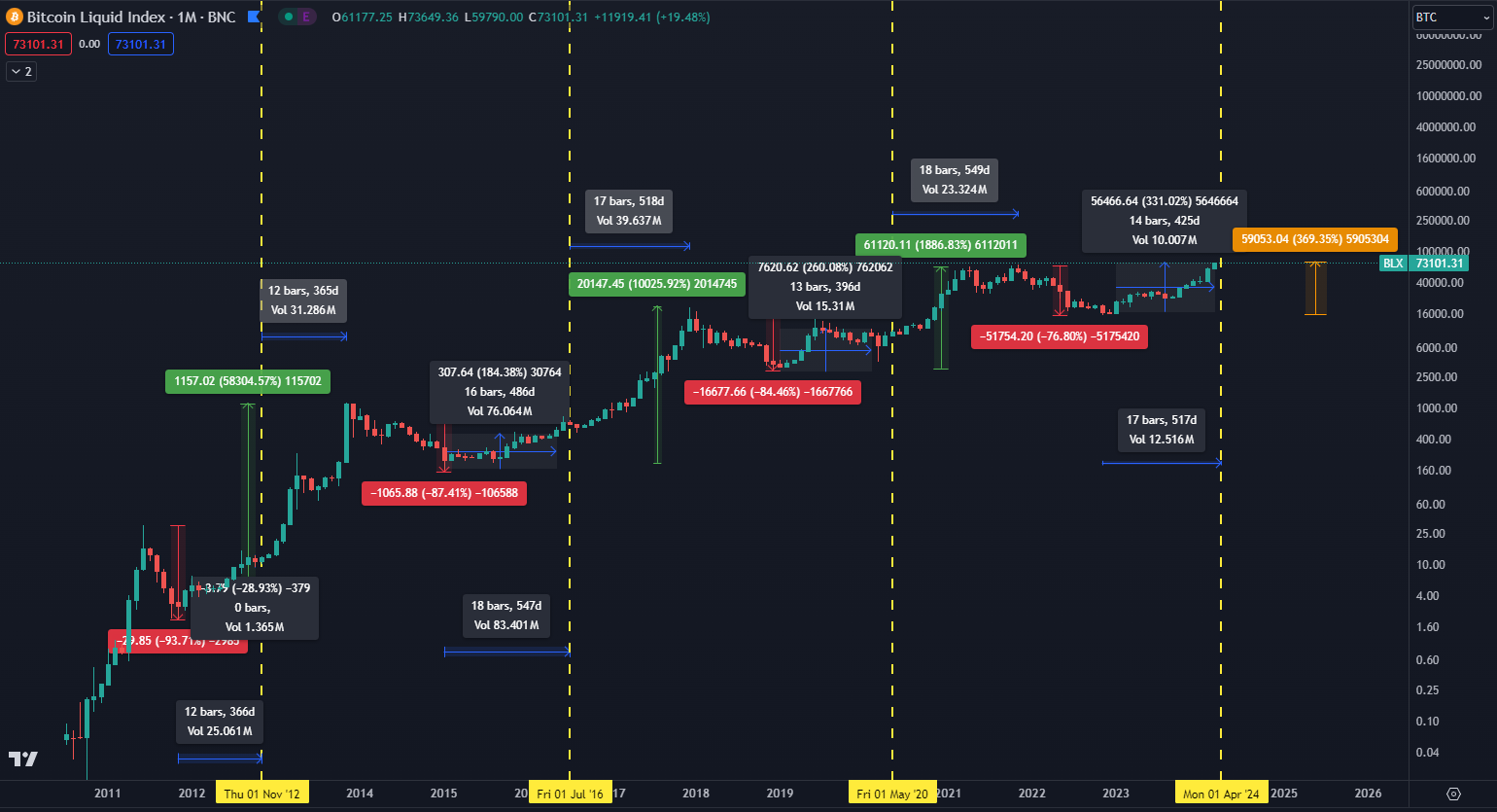 Na tento účel nám poslúži dlhodobý logaritmický graf Bitcoinu, ktorý predstavuje akýsi index trhu. Každý cyklus Bitcoinu je menej ziskový. V poslednom cykle narástla cena o 1 900 %, v tom pred ním až o 10 000 % a 58 000 %. V tomto cykle by mal Bitcoin stúpnuť približne o 400 %. Avšak Bitcoin už má za sebou od minima rast približne 370 % (oranžová trendová čiara), a to ešte nenastal ani halving.