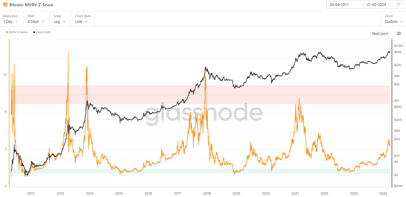 Ak je trhová cena väčšia ako nákupná realizovaná cena, váš obchod je v nerealizovanom zisku. A ak hodnoty MVRV rastú, stúpajú tým pádom aj nerealizované zisky. Ak ich držíme aj napriek rastu ceny, riziko pádu sa stupňuje. Vrchol predstavuje na grafe červená zóna, kedy sú nerealizované zisky príliš vysoké.