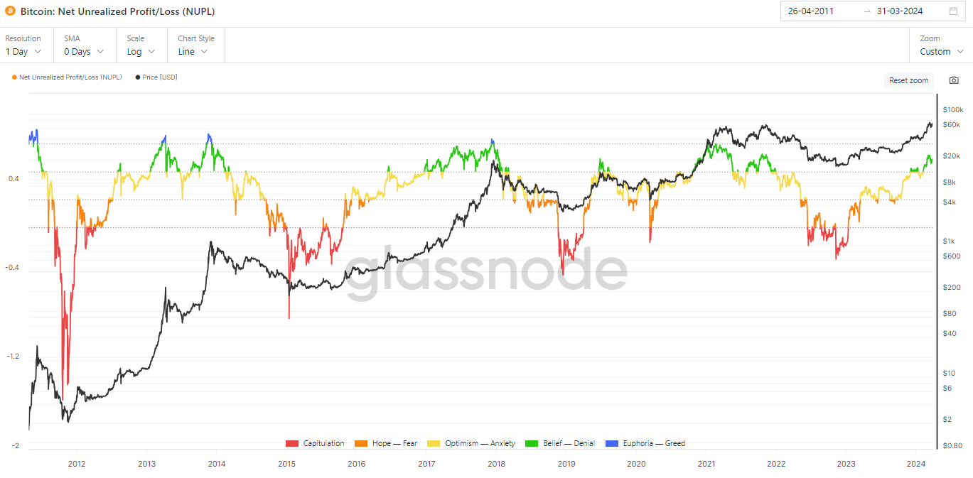 Metrika NUPL (Net unrealized profit/loss) hovorí o pomere nerealizovaného zisku a straty. Ak je metrika vyššia ako nula, nerealizované zisky prevyšujú straty a naopak. Čím NUPL viac rastie, tým sú nerealizované zisky vyššie. Dokonca na grafe vidíte aj fázy trhu podľa toho, kde sa NUPL nachádza.