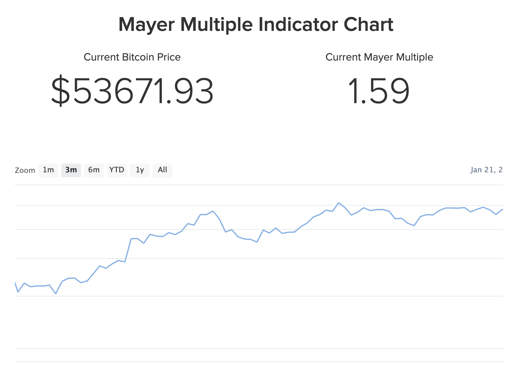 Mayer Multiple je momentálna cena vydelená 200 day moving average. Priemerná hodnota MM indikátora za históriu BTC je 1,45. Momentálne sa hodnota MM indikátora nachádza na úrovni 1,59.