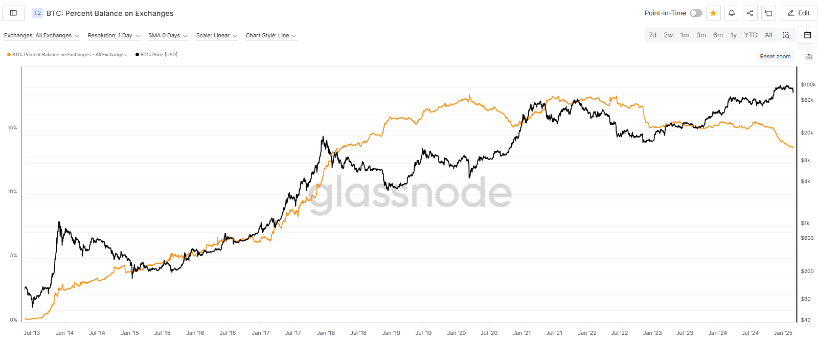 Okrem toho, že skutočná ponuka mincí, ktoré majú svojich majiteľov, môže byť o niekoľko miliónov nižšia, do úvahy je potrebné vziať aj likvidnú ponuku. Podľa údajov Glassnode sa totiž na centralizovaných burzách obchoduje iba 2,71 milióna BTC (13,68 %). Takže väčšina svoje mince predávať odmieta.