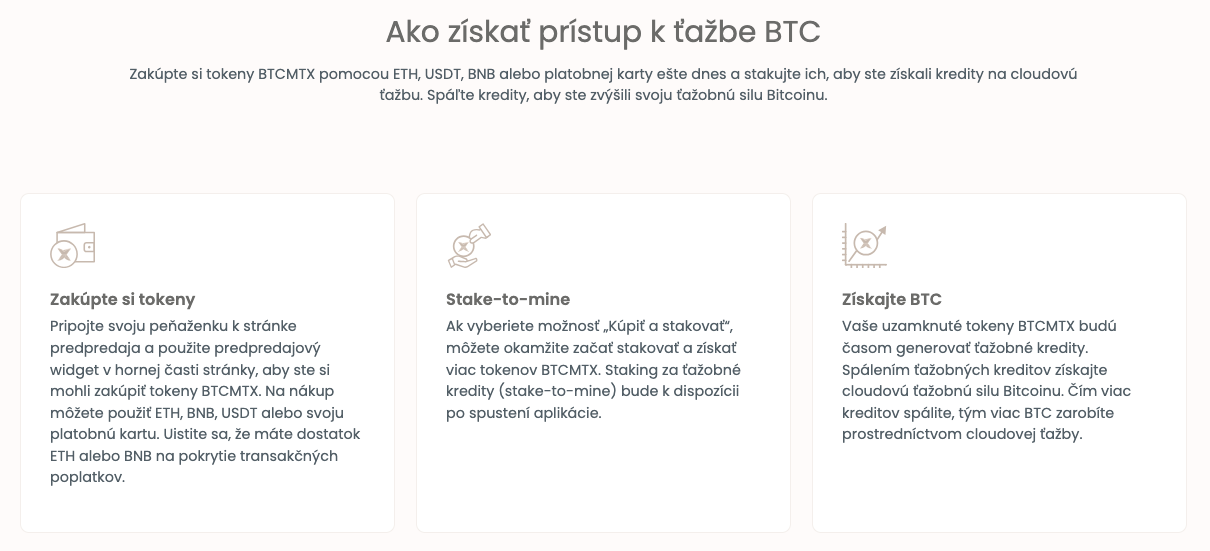 Presne tento stav chce Bitcoin Minetrix zmeniť tokenizovaným miningom. Majiteľom natívnych tokenov BTCMTX ponúka možnosť stakingu zakúpených tokenov za účelom ich znásobenia. Tokeny následne môžu buď vymeniť za časový úsek, kedy budú mať prístup k ťažbe Bitcoinu, alebo ich vymenia za už vyťažené odmeny. Samotné sprístupnenie zabezpečí platforma cez cloud, pričom Bitcoin Minetrix bude prevádzkovať ťažiarenské zostavy a vy budete mať správu tokenov pod palcom v jednoduchej a plne prispôsobiteľnej aplikácii.