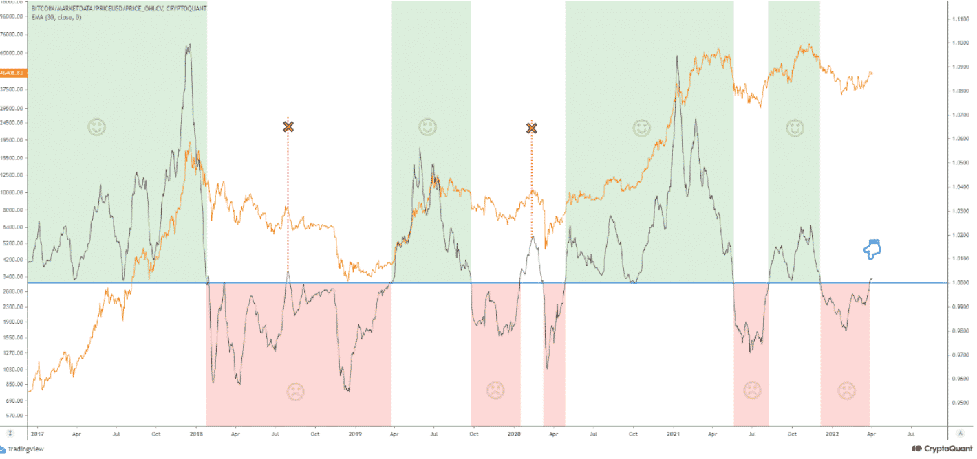 Vyzerá to tak, že počas medvedích období mal indikátor vždy hodnotu menšiu ako jedna, zatiaľ čo býčie trendy sa vyskytli, keď mala metrika hodnotu väčšiu ako jedna. Nedávno STH-SOPR opäť prekonal 1 po tom, čo zostal pod prahom takmer štyri mesiace od decembra 2021.