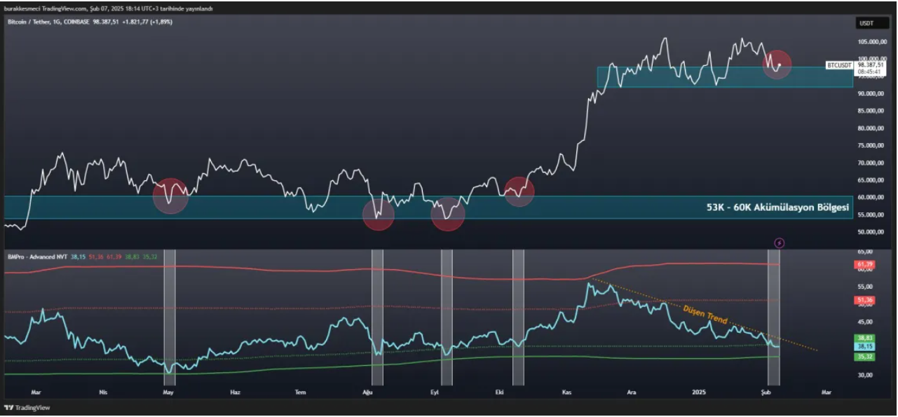 Podľa známeho kryptoanalytika Buraka Kesmeciho Advanced NVT signalizovala lokálne dná na štyroch miestach v minulom roku: 2. mája 2024 (skóre 30,78), 5. augusta 2024 (35,82), 6. septembra 2024 (35,81) a 10. októbra 2024 (38,21).