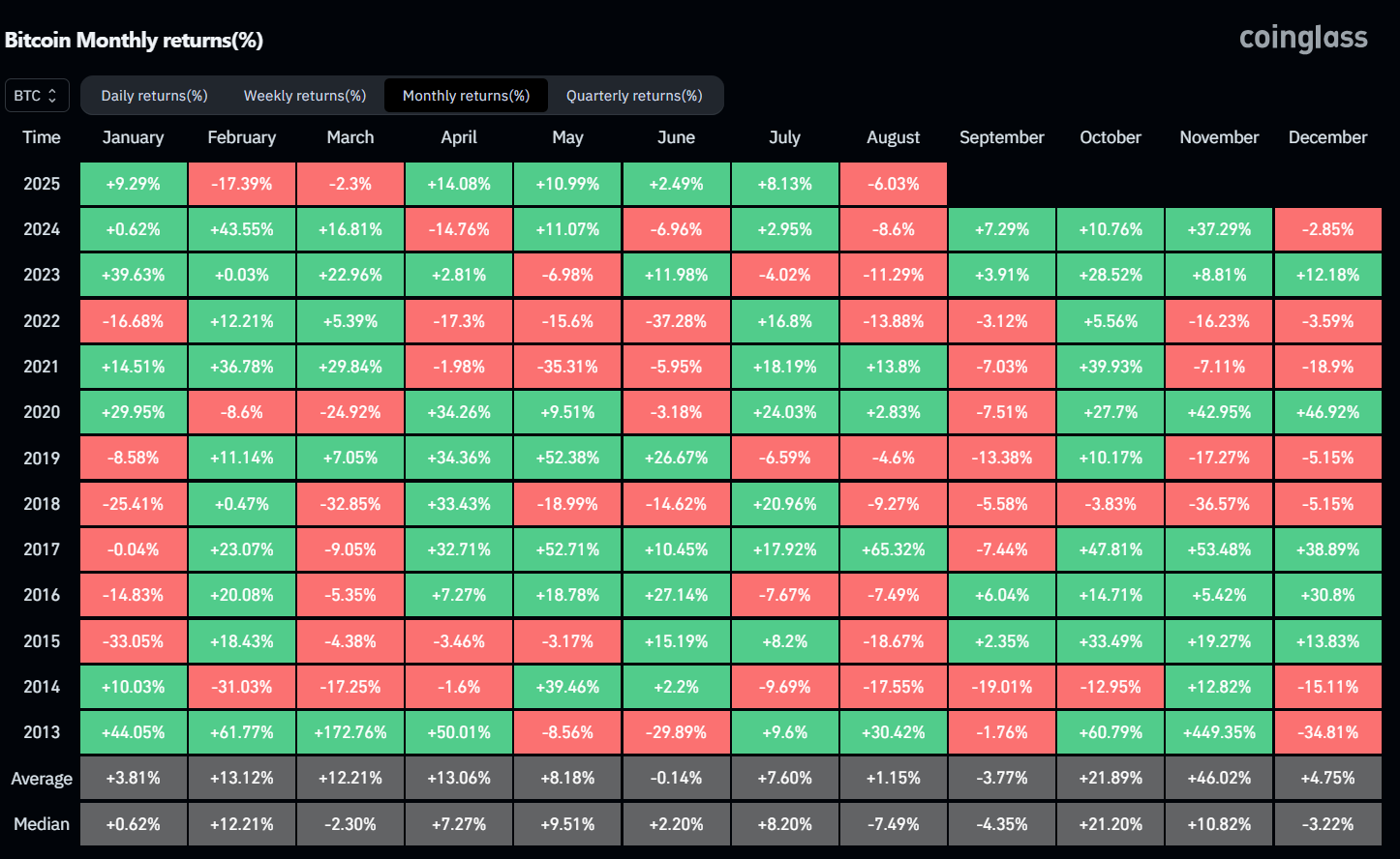 Avšak rast do týchto úrovní by skôr nastal v poslednom kvartáli roku, pretože podľa údajov portálu Coinglass je toto obdobie pre Bitcoin historicky najziskovejšie. Naopak, september je najmenej ziskový mesiac roka, takže výrazná volatilita nahor sa neočakáva.