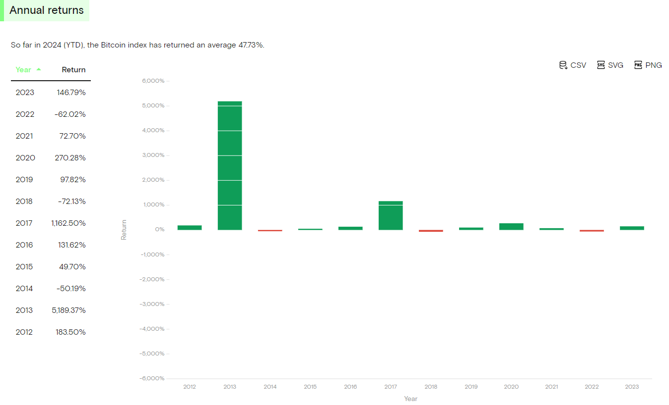 Za posledných 10 rokov bol celkový výkon BTC na úrovni viac ako 14 000 %. Za posledných 5 rokov to bolo 1 600 %. Podľa údajov Curvo v tabuľke nižšie môžete vidieť ročné výnosy bitcoinového indexu od roku 2012. Iba 3 roky boli mínusové a očakáva sa, že rok 2025 by mal byť opäť rastúci.