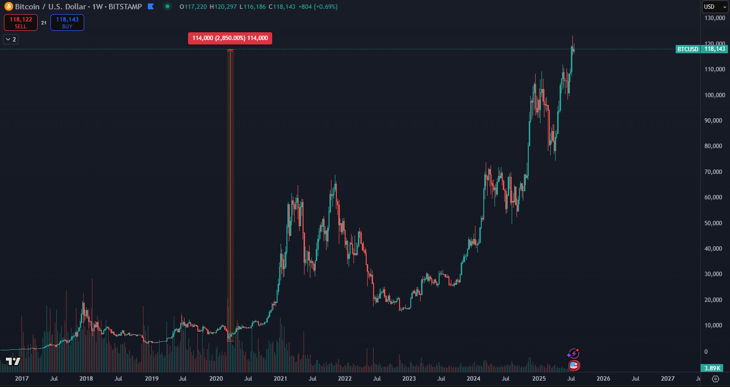 Ak by ste teda nakúpili Bitcoin za 1 000 eur, dnes by ste boli pri cene 118 000 dolárov za 1 BTC v zisku presne 2 850 %. Celkovo by ste tak mali hodnotu účtu 29 500 eur.