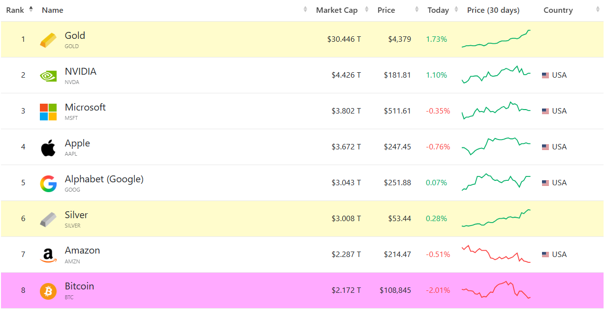 Bitcoin v roku 2025 potvrdzuje svoj status jedného z najvýznamnejších aktív na finančných trhoch. Podľa magazínu Finbold sa jeho cena pohybuje okolo 108 829 dolárov, zatiaľ čo trhová kapitalizácia dosiahla 2,16 bilióna dolárov. Zlato, jeho najväčší rival v kategórii uchovávateľov hodnoty, má v súčasnosti kapitalizáciu 30,414 bilióna dolárov a obchoduje sa za rekordných 4 370 dolárov za uncu, ukazujú údaje z CompaniesMarketCap.