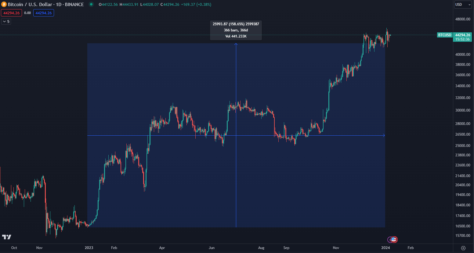 Bitcoin je vysoko rizikový a nie každý rok uzavrie v zisku. Napriek tomu z dlhodobého hľadiska je výkonnosť ceny pozoruhodná, keďže sa digitálne aktívum dostalo z nulovej hodnoty za 15 rokov až na úroveň 44 000 dolárov. Navyše, rok 2023 bol priaznivý a vymazal celú korekciu z predošlého roku 2022, uvádza správa Finbold.