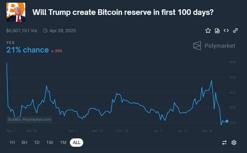 Nástup Donalda Trumpa do prezidentského úradu priniesol nové impulzy pre kryptomenový trh. Polymarket odhaduje 21 % pravdepodobnosť vytvorenia strategických bitcoinových rezerv USA počas prvých 100 dní Trumpovej administratívy. „Amerika na prvom mieste” by mohla zahŕňať aj širšie kryptomenové rezervy.