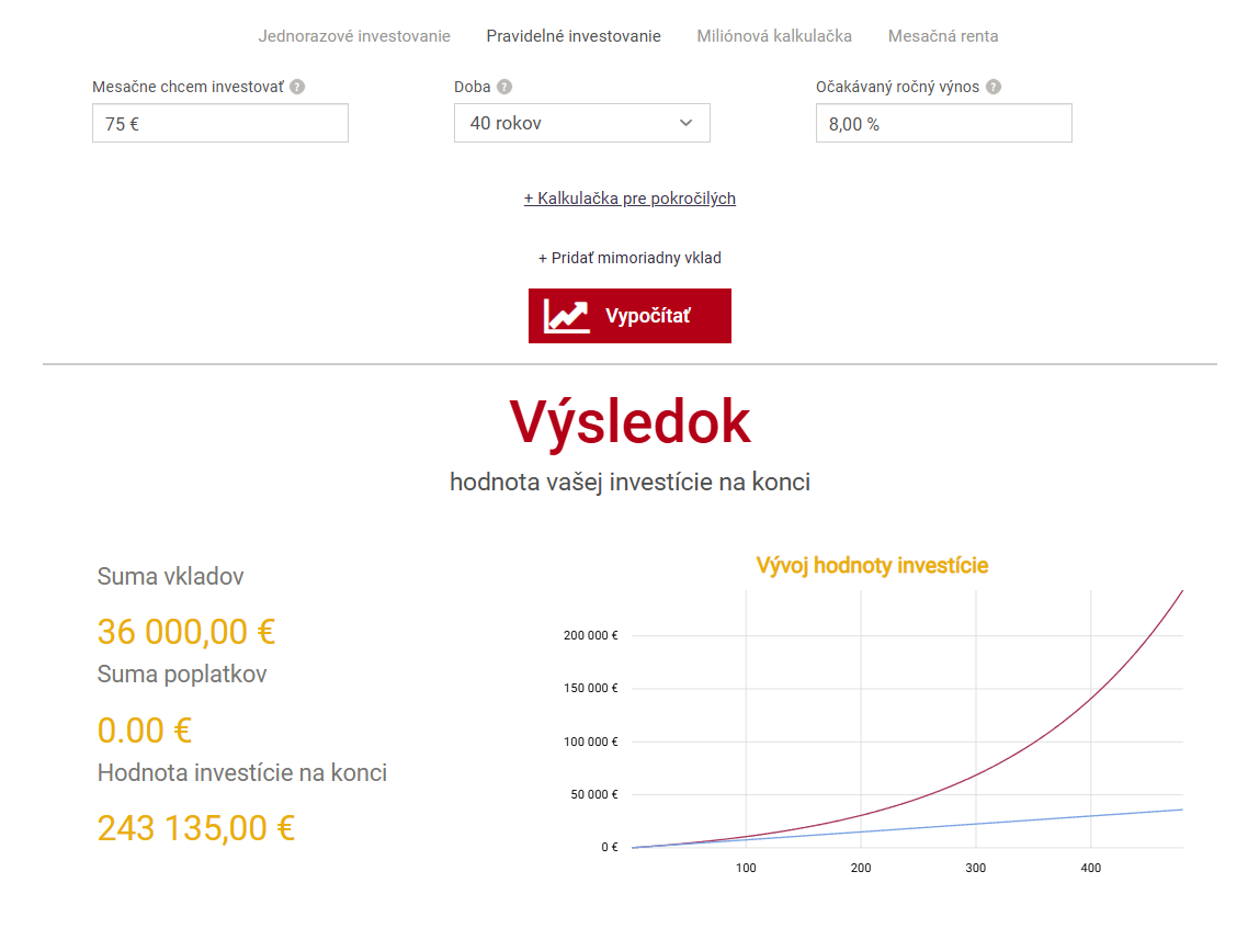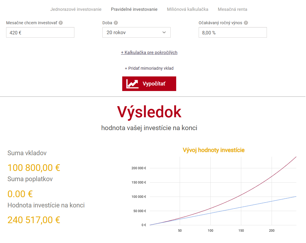Pri výpočtoch vychádzame z 8 % ročného zhodnotenia, čo je približne realistické po započítaní inflácie. Index S&P 500 síce historicky dosahoval priemer okolo 10 %, ale po odrátaní 2 % inflácie pracujeme s výnosom 8 %, ktorý lepšie odráža reálny rast hodnoty investície. Na základe toho vieme vypočítať, koľko je potrebné investovať mesačne, aby ste dosiahli cieľových 240 000 eur.