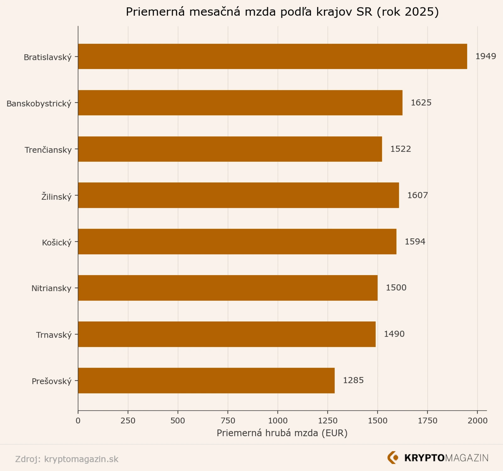 Podľa Štatistického úradu SR bola v roku 2025 priemerná mzda najvyššia v Bratislavskom kraji (1 949 eur ročný priemer, Q4 dokonca 2 068 eur). Najnižšie mzdy eviduje Prešovský kraj s priemerom 1 285 eur. Rozdiel medzi týmito krajmi presahuje 660 eur mesačne.