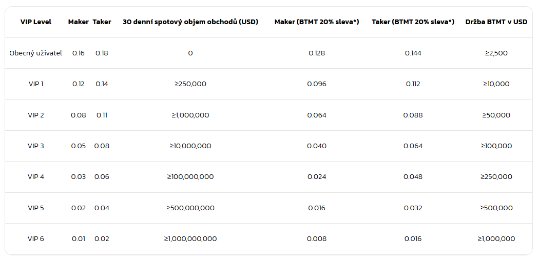 BITmarkets zaviedol odstupňované zľavy z poplatkov za obchodovanie. VIP klienti môžu získať zľavy automaticky, ak splnia niektorú z nižšie uvedených podmienok úrovní. Tabuľka nižšie zobrazuje poplatky pre spotové obchodovanie. Výška poplatkov sa určuje na základe 30-dňového objemu obchodovania prepočítaného na dennej báze v dolároch. Ak sa zaujímate aj o poplatky na futures a maržovej burze, celý prehľad je tu.