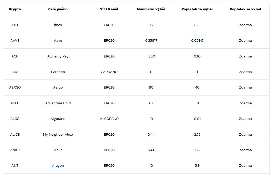 Tabuľka nižšie zobrazuje poplatky za výber kryptomien a minimálnu sumu výberu. Tieto údaje sa líšia podľa toho, o akú kryptomeny ide. Celý zoznam nájdete tu. Sadzby za výber môže určiť samotná blockchainová sieť a môžu kolísať bez predchádzajúceho upozornenia, napríklad z dôvodu preťaženia siete. Poplatky za vklad kryptomien nie sú žiadne. Pri vkladaní a výbere kryptomien buďte mimoriadne opatrní. Použitie nesprávnej adresy peňaženky spôsobí stratu mincí.