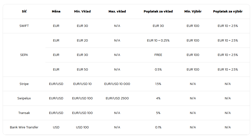 Vklady a výbery fiat mien podliehajú bankovému poplatku za prevod. Za príslušný poplatok sú zodpovedné sprostredkovateľské banky. Tabuľka nižšie zobrazuje poplatky za SWIFT, SEPA a podobne. Rovnako môžete vidieť minimálne vklady.