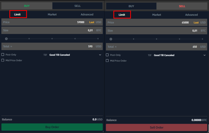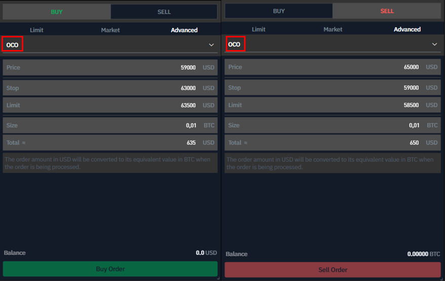 Pri predaji, keď Bitcoin dosiahne 65 000 USD, limitný príkaz bude splnený. To znamená, že príkaz stop limit bude automaticky zrušený. Naopak, keď Bitcoin dosiahne 59 000 USD, spustí sa príkaz stop limit s cenou 58 500 USD a limitný príkaz sa automaticky zruší. V oboch prípadoch obchodujeme množstvo 0,01 BTC.