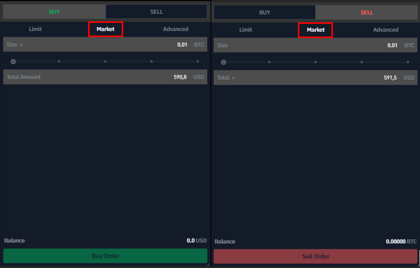 - Size: množstvo kryptomeny, ktorú nakupujeme, resp. predávame. V našom príklade je to 0,01 BTC.