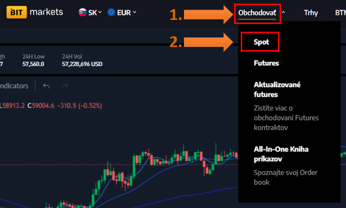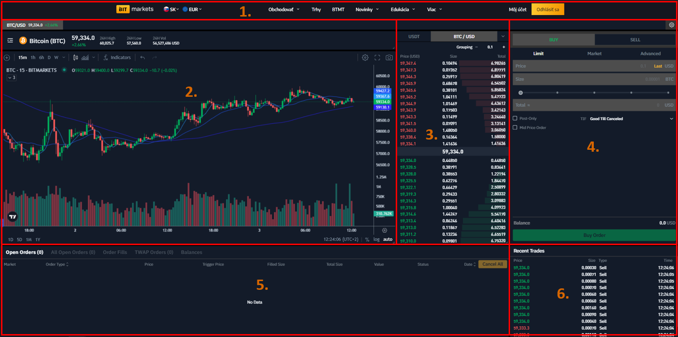 Teraz je načase predstaviť si obchodnú platformu BITmarkets. Dostanete sa do nej cez hlavné menu Obchodovať -> Spot. Rozloženie jednotlivých sekcií platformy si definujeme na spotovom trhu, keďže na futures máme rovnaké funkcionality.
