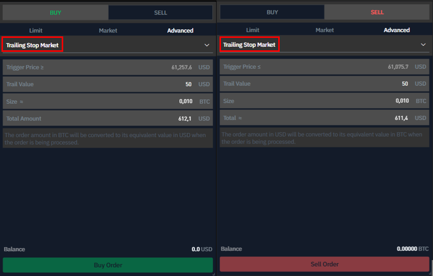 - Trigger price: spúšťacia cena, pri ktorej sa otvorí objednávka. Mení sa podľa toho akú hodnotu zvolíte pri Trail value.