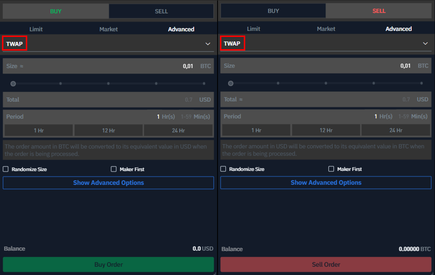 TWAP sa využíva vtedy, ak veľkosť vašej objednávky presiahne likviditu dostupnú v knihe čakajúcich objednávok. Na BITmarkets tento príkaz umožňuje nastavenie časového rozsahu na 1,12 a 24 hodín. Počas tejto vami zadanej doby bude algoritmus zadávať objednávky v pravidelných intervaloch. V našom príklade sme zvolili množstvo 0,01 BTC.