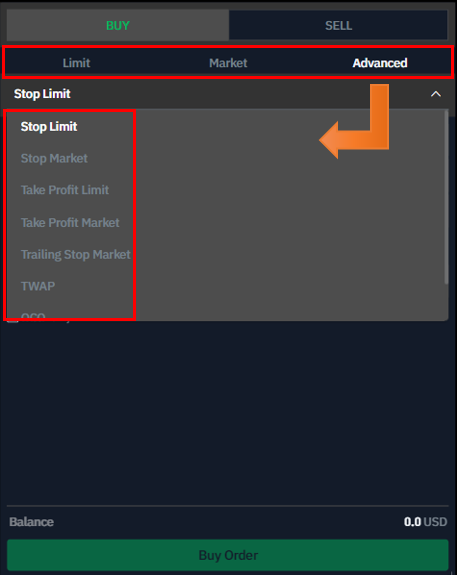 Všetky tieto typy objednávok viete nájsť v sekcii obchodných príkazov. Buď zvolíte Trh, Limit alebo Advanced. Pod Advanced sa vám následne objavia ďalšie uvedené príkazy.