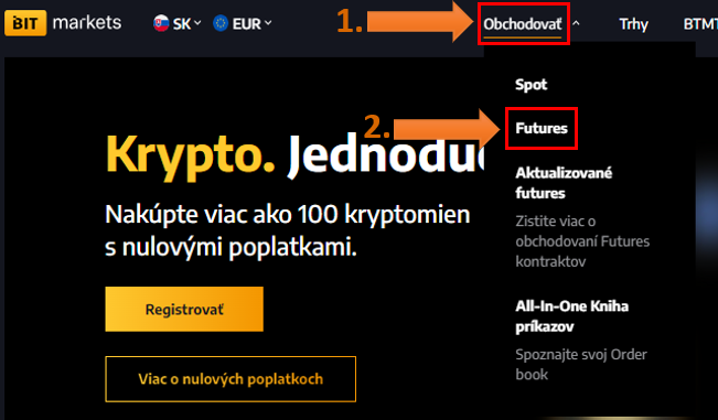 Kryptomenová burza BITmarkets ponúka aj obchodovanie s futures. Do tejto sekcie sa dostanete cez hlavné menu Obchodovať -> Futures. Futures je kontrakt alebo zmluva, ktorej hodnota alebo cena je úplne alebo čiastočne odvodená od hodnoty, resp. ceny aktíva alebo indexu.