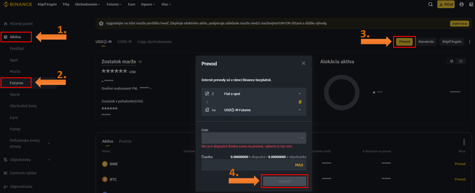 Po prihlásení sa na burzu Binance potrebujete najprv presunúť kapitál zo spotovej peňaženky na futures peňaženku. Finančné prostriedky sú pre futures totiž separované zvlášť. Viete si previesť tak fiat menu, ako aj kryptomenu. Stačí vojsť do sekcie Aktíva → Futures → Prevod.