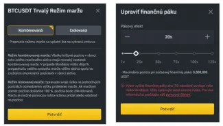 Okrem výberu druhu páky viete zvoliť aj výšku marže. Binance ponúka maximálnu finančnú páku 125x, no iba pre niektoré páry, ako napríklad trvalé futures kontrakty ETHUSDC, ETHUSDT, BTCUSDC a BTCUSDT.