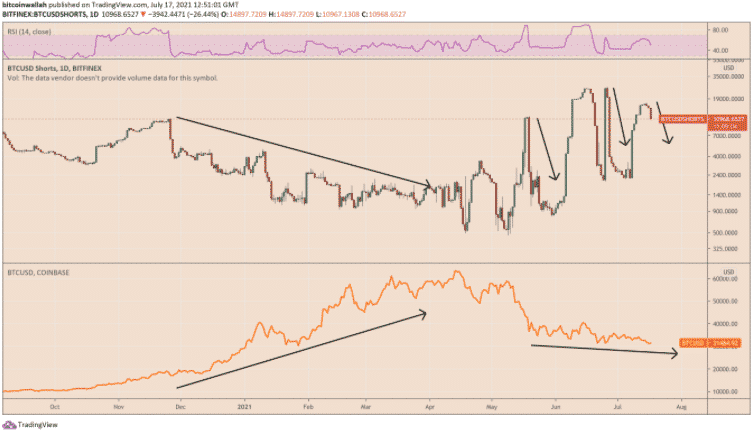 Nedávna korelácia medzi spotovými cenami Bitcoinu a jeho maržovými short pozíciami na Bitfinexe. Zdroj: TradingView