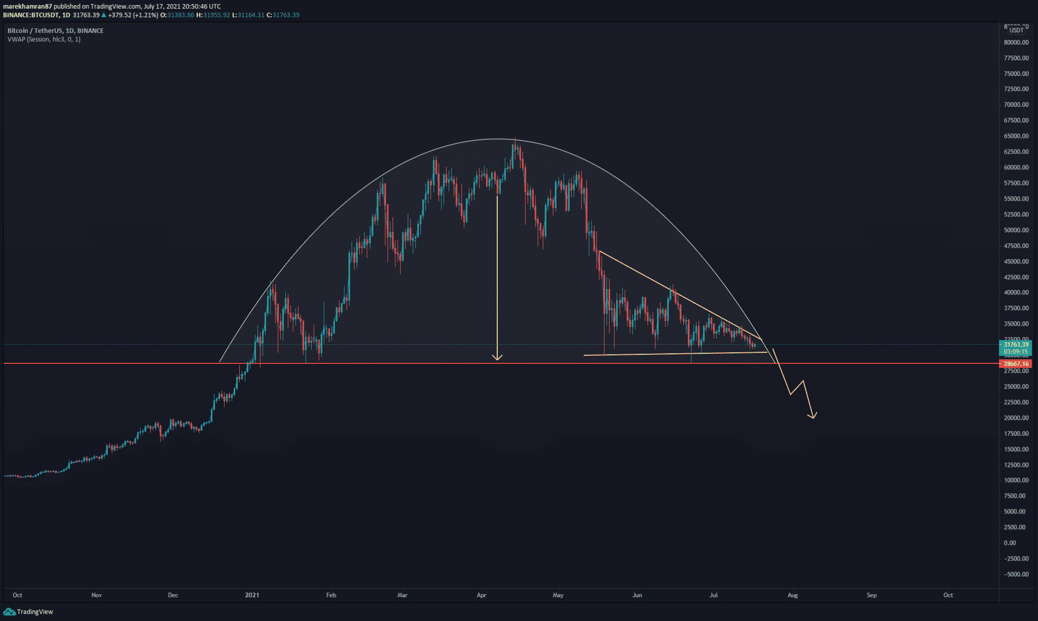 Medvedie obdobie bolo aspoň z časti pozastavené poklesom pozícií na Bitfinexe. Na grafe BTC sa aktuálne vytvorila potencionálna inverzná formácia, ktorá naznačuje, že po prepade na 31 000 USD sa Bitcoin posunie ešte hlbšie až na úroveň 20 000 USD. To je jeden scenár, ktorý môže nastať.