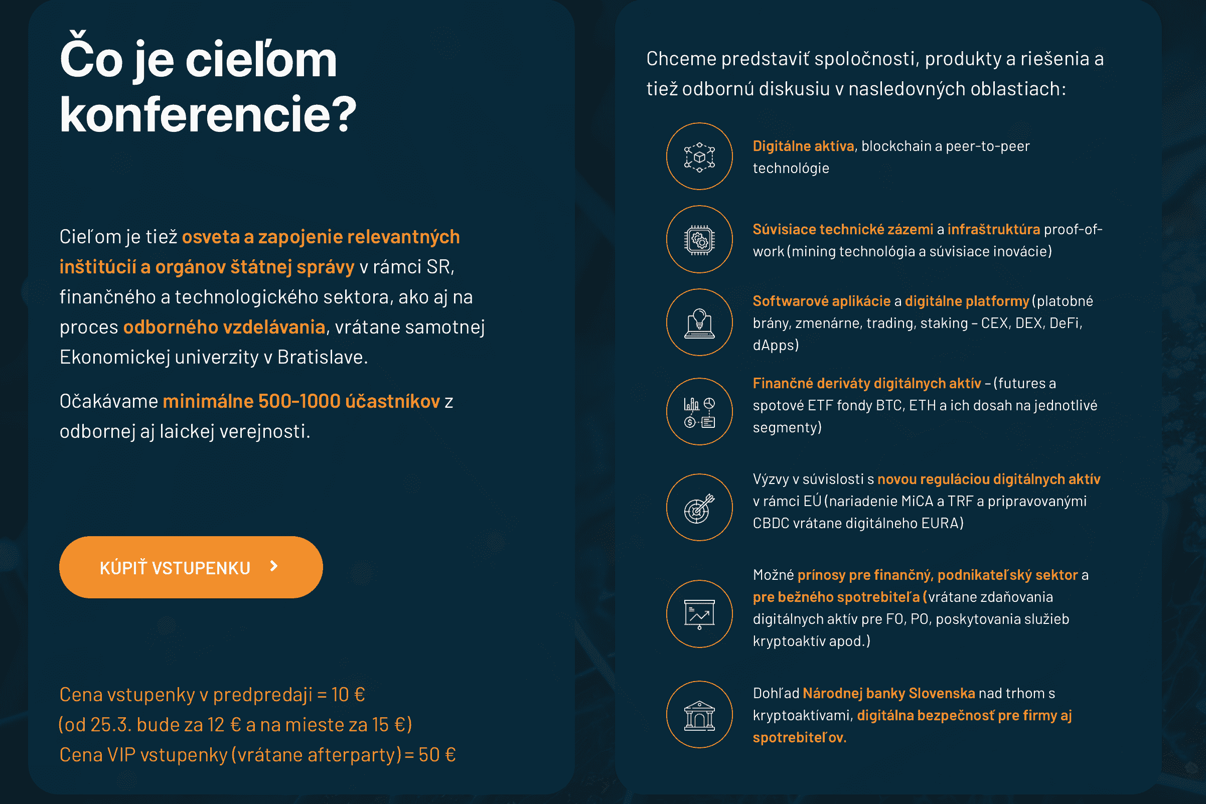 Už v apríli sa bude v Bratislave konať najväčšia kryptomenová konferenica, kde nesmiete chýbať ani vy. Do 25. 03. 2024 navyše viete vstupenky získať v zľave iba za 10 eur.