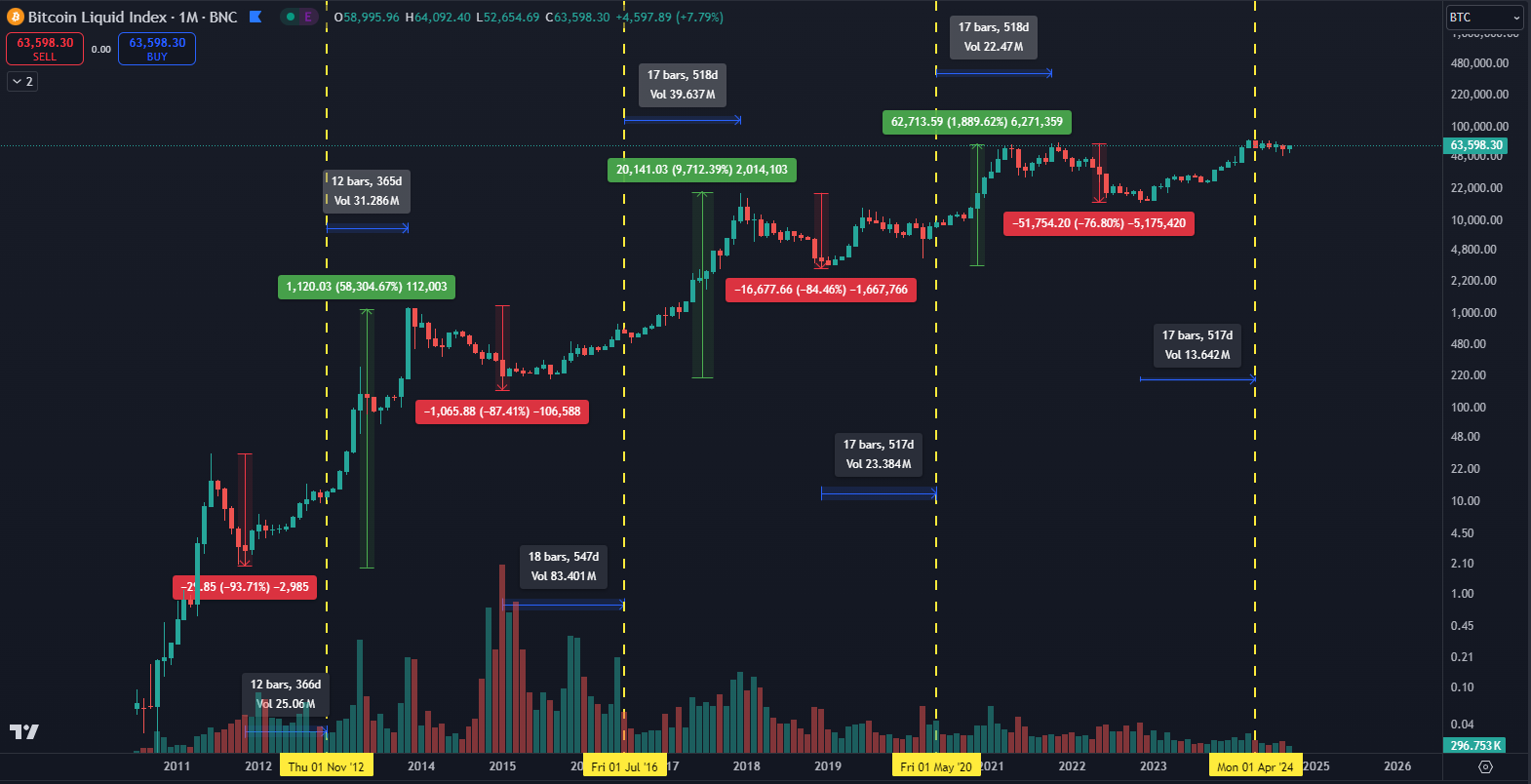 Graf nižšie zobrazuje halvingové cykly BTC (žlté vertikálne čiary). Ceny kryptomien rastú približne rok po halvingu, následne rok klesajú, potom nastane fáza akumulácie a opäť ročný rast pred ďalším halvingom. A takto sa to opakuje. Z tohto hľadiska sa zatiaľ nič nemení a môžeme pozorovať, že cykly ostávajú neporušené.